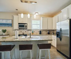 The fully equipped kitchen is a chef's dream, complete with modern appliances, ample counter space, and a charming dining area where you can savor meals together while taking in stunning views.