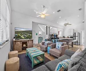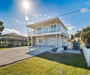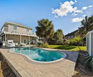 The 4 bedroom, 3 bath home has everything you’ll need for the perfect beach getaway. With two living rooms, a game room, and a luxe patio with pool, your group will have plenty of room to spend quality time together. Wake up to sounds of waves on the shore, and sneak a peek of the ocean from the wraparound balcony.