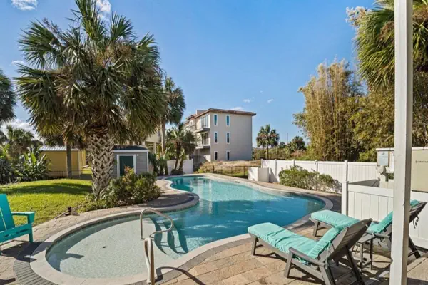The fully enclosed, private backyard features a pool and plenty of space to lounge in the sun. Outdoor furnishings include two loungers and a sectional.