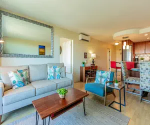 Step into this thoughtfully designed, climate-controlled space where elegant furnishings and tasteful décor create a serene tropical atmosphere. The open-concept living area flows seamlessly to your private lanai, where you can enjoy stunning ocean views and spectacular Maui sunsets. Split AC units in every room ensure you can maintain your ideal temperature throughout your stay.