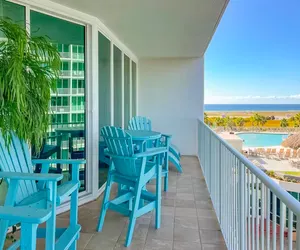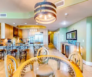 Caribe The Resort, Unit 401-D, is a beautifully decorated 2-bedroom, 2-bath condo that can accommodate up to 10 guests, making it perfect for families or small groups. The condo features floor-to-ceiling windows, providing stunning views and plenty of natural light. The kitchen is equipped with stainless steel appliances, and the bar includes an ice maker and a wine cooler, adding a touch of luxury. The dining area seats four at the table, with an additional four barstools at the breakfast bar for more seating options.