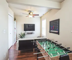 Inside, the house is tastefully decorated with comfortable beds, plenty of seating, and a fully equipped kitchen, including a large breakfast bar for casual dining. The living room is designed for relaxation, with cozy seating, a TV, and access to fast WiFi for your entertainment. After a day of sightseeing or outdoor activities, unwind with a game of foosball or ping pong, or simply soak in the private hot tub.