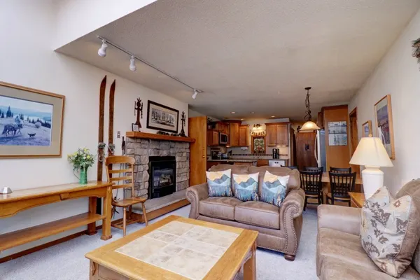 Enjoy the magnificent views of the ten mile range mountains, while hanging out with your guests, enjoying the ambience of the gas fireplace, or watching TV. The living room and dining room table each have seating for up to 8 people. The open-concept layout seamlessly connects the living room, dining area, and fully equipped kitchen, creating a warm and inviting atmosphere for gatherings with family and friends.