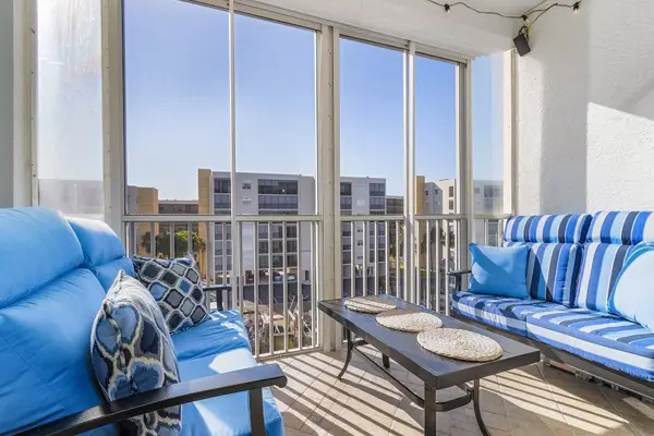 The view from this fourth floor vantage point is of the marina below and the gulf in the distance. The balcony extends from the living room to the master bedroom area.
