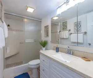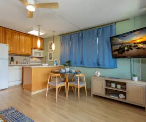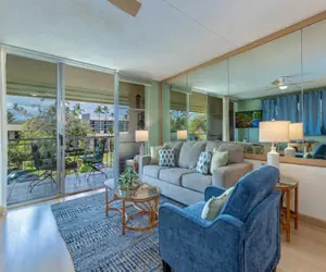 Welcome to your perfect Maui getaway at Kihei Kai Nani 8-363, where Aloha Chic design meets stunning sunset, sunrise and mountain views. This thoughtfully appointed 1-bedroom condo is at the back of the property, furthest from the main road, making it more peaceful. 8-363 features a spacious living area with TV and a sleeper sofa, perfect for accommodating up to 4 guests. The bedroom offers optimal comfort with a queen bed, portable AC, Smart TV, and cooling cross-breeze through screened louvered windows. The updated bathroom showcases a beautiful tiled walk-in shower.