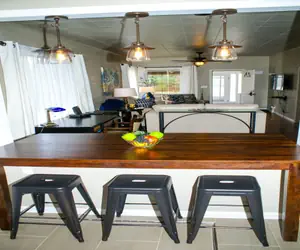 - In the renovation of the home, we opened the kitchen to the living area and provided a cool table space convenient for eating, working and visiting.