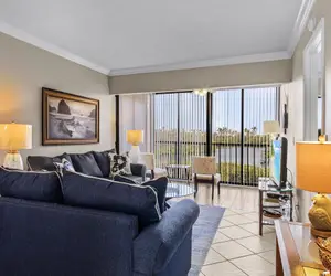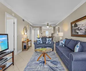 The condo features a comfortable and bright open-concept living space with tasteful décor and coastal accents that create a warm, welcoming atmosphere.