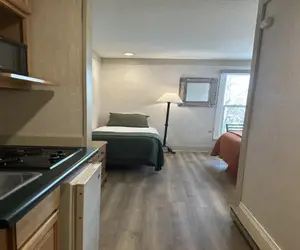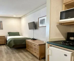 This adjoining room setup allows bedding for up to 6 individuals, and is great for families or small groups. This unit combines two kitchenette style hotel rooms with an adjoining door.