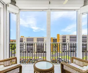 The balcony extends from the living room to the master bedroom area. At the master bedroom end of the balcony, behind louvered doors, is the laundry area with full size washer and dryer as mentioned above.
