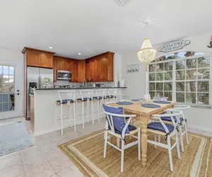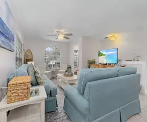Amenities of this vacation destination include a heated swimming pool, central air conditioning, ceiling fans throughout, complimentary WiFi/streaming TV, all towels and linens, and private laundry.