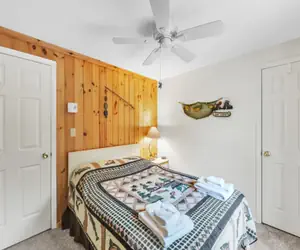 This beautifully decorated three-bedroom townhome offers a warm Adirondack ambiance and a private play area, making it an excellent choice for families. With a scenic view from the living area, this unit provides both comfort and convenience for a memorable getaway.