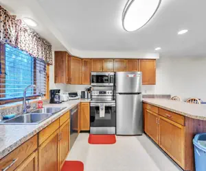 The home is equipped with air conditioning in the living room and master bedroom, ensuring a pleasant stay during warmer months. Guests can enjoy free internet service, a Jacuzzi tub for relaxation, and a brand-new gas grill, kitchen stove, and microwave for easy meal preparation. For entertainment, the townhome includes both a DVD and VHS player, perfect for cozy movie nights.