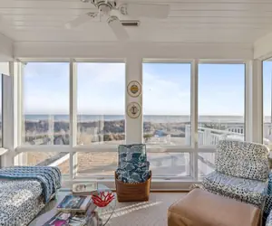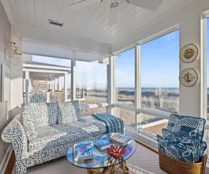 The heart of this residence is the 2nd floor, where rich wood accents, and large windows frame panoramic ocean views. The cozy light-filled sunroom is the perfect gathering place to not only admire the blue-green sea, but also for sipping a morning beverage, an evening cocktail or enjoying conversation. The open concept living room/dining room has ample space to spread out and plan for the day’s adventures or relax in the evening. The kitchen with its ocean color cabinets invites you in to prepare meals after lazy days at the beach.