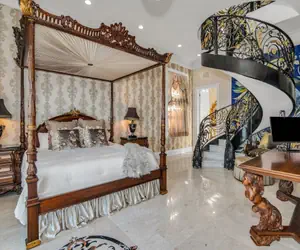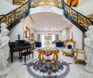 As you step through the grand entrance, you'll be greeted by a magnificent marble double staircase, a dazzling chandelier, and a grand piano, setting the stage for an unforgettable stay. A beautifully designed bar area with two mini wine refrigerators invites you to unwind in style.