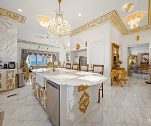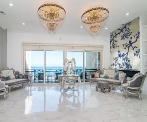 The first floor boasts two spacious sitting areas, each offering breathtaking ocean views, perfect for relaxing with family and friends. The open-concept kitchen is a chef's dream, featuring a Zline Dual Fuel Range gas stove, a large island, and exquisite finishes. Adjacent to the kitchen, the formal dining room is fit for royalty, with gold accents and elegant décor that elevate every meal.