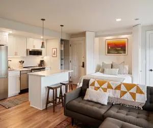 Designed to comfortably accommodate up to four guests, the space features a queen bedroom plus a Murphy bed in the living area, making it a great option for couples, friends, or small families. Both bathrooms have been thoughtfully remodeled with walk-in showers, perfect for relaxing after a day spent outdoors.