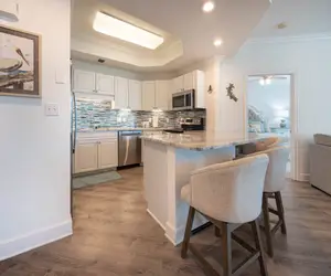 Phoenix on the Bay Unit 1513 is a stunning three-bedroom, three-bath condo that sleeps up to eight guests. The master bedroom features a king-size bed, private balcony access, and an en-suite bathroom with a double vanity, Jacuzzi tub, and walk-in shower. The second bedroom also has a king-size bed, a flat-screen TV, and its own bathroom with a tub-shower combination. The third bedroom offers two queen-size beds, a flat-screen TV, and a private bathroom.