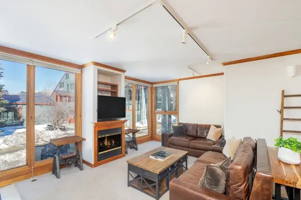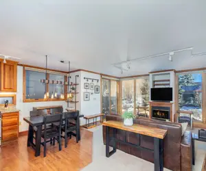 Enter the spacious living/dining area, complete with floor to ceiling windows, a full sized private deck with views of the surrounding mountains, a fully stocked kitchen, and a dining area with seating for 4. The living area contains a gas fireplace, flatscreen smart TV, and a comfortable seating area for socializing and relaxing. There is a half bath off the entrance of the condo.