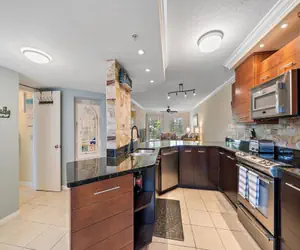 • Large, fully equipped kitchen with granite countertops, stainless steel appliances, and ample cabinet space.