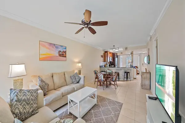 • Spacious open living area with plush seating, a flat-screen TV, and glass sliders leading to the screened-in lanai.