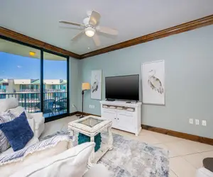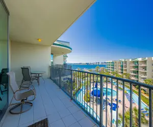 The tiled balcony offers plenty of seating for relaxing while taking in views of Robinson Island and Perdido Pass. Guests can enjoy amazing amenities, including a lazy river, and the condo is just a short drive to Orange Beach beach access.