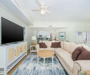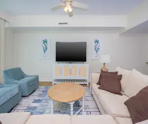 Inside, the kitchen is fully equipped with stainless steel appliances, white cabinetry, and a spacious breakfast bar that seats four. Just off the kitchen, you’ll find a separate wet bar complete with an ice maker and extra sink — a great feature for entertaining or enjoying a cold drink after a day in the sun. Flat-screen TVs are located throughout the condo, providing entertainment options for everyone.