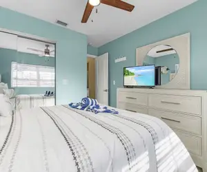 This spacious home features four elegantly designed bedrooms, accommodating up to eight guests comfortably. Each bedroom is equipped with a smart TV, including the living area, allowing for ultimate convenience and entertainment. The primary bedroom boasts a king-sized bed and an ensuite bathroom featuring a large tub in the shower/tub combo, along with a dual sink counter for added comfort. The three additional bedrooms each feature cozy queen-sized beds, ensuring everyone has a restful night's sleep. Each bedroom also offers spacious closets, giving you plenty of room to store your belongings. With two full bathrooms and an additional half bath, convenience is at your fingertips.