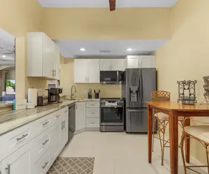 For your convenience, the home includes modern amenities like a fully stocked kitchen with a refrigerator, stove, microwave, dishwasher, plenty of utensils, dishes, and spices. Enjoy your meals in the dining area, or have a casual breakfast at the bar. A Keurig coffee maker and drip coffee machine are provided, ensuring you can start your day with a fresh cup of coffee. The grill on the patio is ready for your outdoor cooking needs as well.