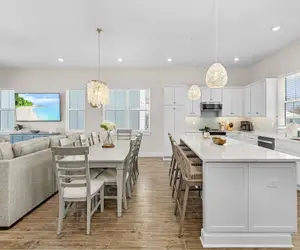 The heart of the home is the open-concept living area, ideal for gathering with loved ones. The fully equipped kitchen is a chef's dream, complete with modern appliances and an oversized island perfect for preparing meals, entertaining, or enjoying casual breakfasts. A nearby dining area offers the perfect setting for shared meals and conversation.