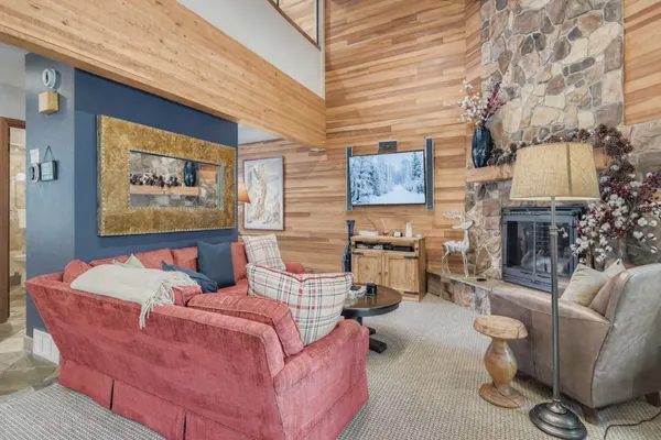 The main level welcomes you with an open-concept design, centered around a stunning stone gas fireplace. The gourmet kitchen features high-end appliances, generous counter space, and flows seamlessly into a dining area with seating for 10+ and additional seating at the counter and den. The adjacent den offers a queen sleeper sofa.
