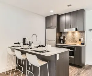 The adjacent dining space and kitchen are equipped for easy meals at home, with all the basics provided, from cookware to a full-size refrigerator and stove. Whether you're cooking a hearty breakfast before heading out or enjoying takeout from a local favorite, the setup is made for ease and comfort.