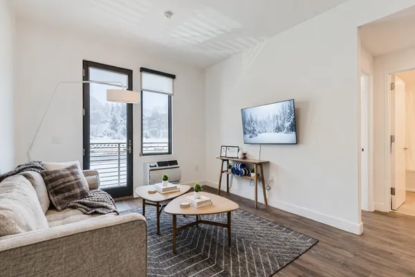 The living area is cozy and welcoming, with a simple, functional layout perfect for kicking back after a day on the slopes or the trails. A soft queen sofa sleeper, a warm fireplace, and a TV create a casual space to unwind. Large windows invite in natural light and hint at the beauty just beyond the doorstep.