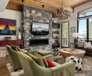 Inside, you’ll find a spacious open-concept living area centered around a grand stone fireplace, a gourmet chef’s kitchen with premium appliances, and a large dining space perfect for après-ski dinners.