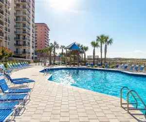 The fully equipped kitchen is a culinary haven, featuring stainless steel appliances, granite countertops, and casual high-top seating for two. Whip up delicious meals with ease using all the essentials provided in your condo.