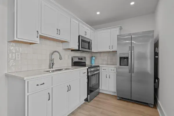 • The kitchen features modern appliances, and sleek countertops.