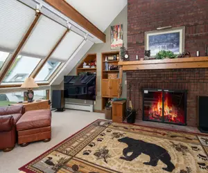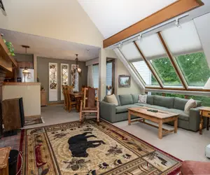 Spread across two spacious levels, this home sleeps up to 10 guests and is perfect for family vacations or mountain getaways with friends. The upper level features a bright and airy living room with vaulted ceilings, sloped skylights, a cozy floor-to-ceiling brick fireplace, and a flat-screen TV—perfect for relaxing after a day on the mountain. Just off the living room, the dining area seats eight and opens onto a deck with stunning mountain views.