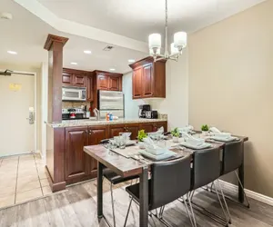 Dining and Kitchen Share meals and laughter around the spacious dining table for six, with wood floors adding a cozy rustic touch. The fully equipped kitchen, fitted with stainless steel appliances, awaits your culinary creativity, making it easy to enjoy home-cooked meals and delicious treats.