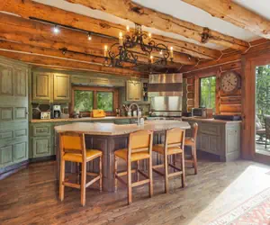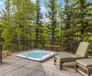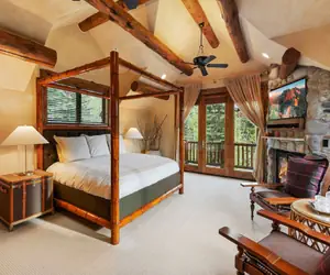 This cabin home welcomes you with a warm and inviting great room featuring vaulted ceilings, a striking wood-burning fireplace, and expansive windows that frame views of the surrounding aspen trees. This space flows seamlessly into a gourmet kitchen outfitted with high-end appliances, including a Viking 6-burner gas stove with griddle, Sub-Zero freezer, and a generous island with seating. A walk-in pantry and bar area with wine cooler offer added convenience, while a large dining area with built-in bench seating sets the scene for memorable group meals and entertaining. This level features a cozy guest room with a queen bed, adjacent to a spa-inspired bathroom with a step-in rain shower and single vanity. Step outside to an expansive deck that feels like an extension of the home. Complete with a gas grill, outdoor dining and lounge space, and a private 8-person hot tub, it's the perfect place to relax and unwind after a day on the mountain.