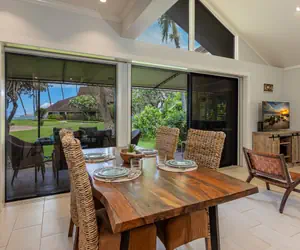 Step inside and enjoy the open-concept living space featuring a flat screen TV, air conditioning, and a sofa sleeper for additional sleeping accommodations. The indoor dining table seats four, perfect for shared meals or game nights. Sliding glass doors open onto your spacious private lanai, where you’ll find a second dining table for six and additional lounge seating—ideal for enjoying morning coffee, sunsets, or dining al fresco.