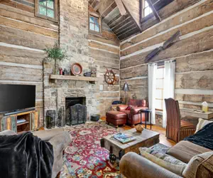 Step back in time without sacrificing modern luxuries at this extraordinary lake-access cabin on beautiful Lake Guntersville, formerly known as "Two Cabins Lodge." Crafted from hand-scraped 36” timbers, this home brings history to life while offering every comfort needed for a relaxing getaway.Originally built from two pre-Civil War log cabins, the property has been fully restored and thoughtfully updated by Karen Tillery, famed interior designer who is routinely featured on Barnwood Builders on the Magnolia Network. You’ll find rich hardwood floors, reclaimed antique lumber ceilings, and one-of-a-kind features like a builder’s signature dating back to August 4, 1859. Every detail tells a story — from barn wood cabinetry sourced from an early 1800s West Virginia barn to stair treads carved from solid antique hickory and poplar.Perfect for families and groups, this spacious retreat boasts 4 bedrooms, 5 bathrooms, and sleeping space for up to 20 guests, including a fun loft with built-in bunks and two trundle beds. Gather in the stunning two-story family room and listen to some vinyl, whip up meals in the well-appointed eat-in kitchen with honed granite countertops, or relax in the large club room downstairs.Located just steps from Lake Guntersville, you’ll have easy access to swimming, fishing, and boating, with plenty of room inside and out to unwind after a day of adventure. Whether you’re savoring the craftsmanship of this historic home or enjoying modern comforts like WiFi and flat-screen TVs, this cabin provides a truly unique vacation experience.Make lasting memories with friends and family at this remarkable retreat where the past meets the present on the banks of the Tennessee River’s Lake Guntersville.