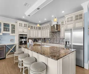 Step inside through the charming entryway and choose your path: take the elevator up from the garage or walk one flight of stairs to the expansive second level. Here you'll find an open-concept layout designed for connection and comfort. The fully equipped kitchen features a spacious island with 4 barstools, perfect for chatting while meals are prepared. A dining table for 8 sits just steps away, making group dinners a breeze. The cozy living room invites you to sink into the U-shaped sectional and enjoy the large flat-screen TV with streaming, YouTube TV, and SONOS speakers. Sliding glass doors open to a screened-in balcony overlooking the canal (and even a peek of the gulf!), furnished with plush seating—perfect for morning coffee or evening cocktails.