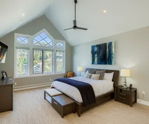 Upstairs, each of the three bedrooms offers privacy and relaxation, with its own full en suite bathroom. The luxurious master suite is a true retreat, featuring a plush king bed, large windows, and a second wood-burning fireplace—perfect for cozy nights in. The spa-inspired master bath includes a jetted soaking tub, dual vanities, and a walk-in shower for a truly indulgent experience. The additional bedrooms are equally well-appointed, ensuring that every guest enjoys restful nights and refined comfort.