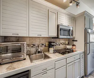 The well-equipped kitchen includes a full-sized refrigerator, stovetop, microwave, dishwasher, toaster oven, and coffee maker—everything you need for a comfortable stay.