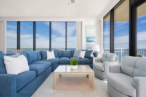 The open-concept living area is designed for comfort and gathering, featuring a large sectional sofa, swivel accent chairs, and a flat-screen TV—ideal for movie nights after a day in the sun. Floor-to-ceiling windows flood the space with natural light and showcase the incredible Gulf views.