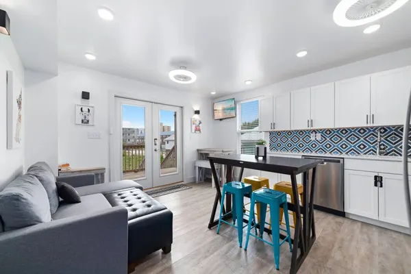 The open-concept living space is perfect for gathering, featuring a modern kitchen with stainless steel appliances, side-by-side fridge with icemaker and water dispenser, sleek backsplash, and abundant cabinetry. Share meals at the dining table, pull up a stool at the breakfast bar, or make use of the extra table and seating in the corner. After a day in the sun, settle into the cozy living area with its queen sleeper sofa and mounted flatscreen TV.
