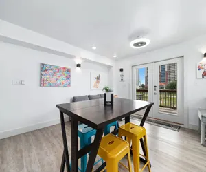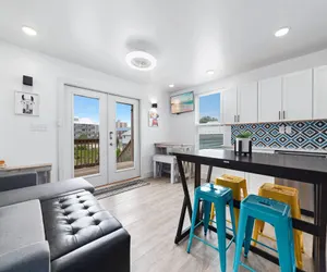 The open-concept living space is perfect for gathering, featuring a modern kitchen with stainless steel appliances, side-by-side fridge with icemaker and water dispenser, sleek backsplash, and abundant cabinetry. Share meals at the dining table, pull up a stool at the breakfast bar, or make use of the extra table and seating in the corner. After a day in the sun, settle into the cozy living area with its queen sleeper sofa and mounted flatscreen TV.