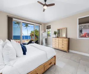 The primary bedroom suite opens right to the lanai and ocean view. Leave the sliding door open and drift to sleep by the sounds of the ocean. The suite's bathroom is luxurious and provides abundant space. There's a walk-in shower with multiple shower heads, two vessel sinks and a long makeup counter. Two guest bedrooms are bright, spacious and comfortable and a second full bathroom is also beautifully appointed. There is also a half bathroom near the great room.