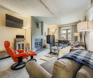 The condo features a spacious master bedroom with a king bed, a flat-screen TV, and incredible mountain views. In the living room, you’ll find a comfortable queen sleeper sofa, a twin sleeper sofa, another flat-screen TV, and a dining area with seating for six, all centered around the wood-burning fireplace, perfect for relaxing after a day on the slopes.