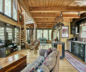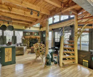 The cabin’s warm wood interior and inviting décor create a cozy mountain atmosphere with a touch of artistic flair. A stunning spiral staircase leads to the upper level, adding a unique focal point that feels both rustic and timeless. Whether you’re curling up by the fireplace, sharing meals around the table, or simply enjoying the cabin’s thoughtful details, you’ll find comfort and character at every turn.