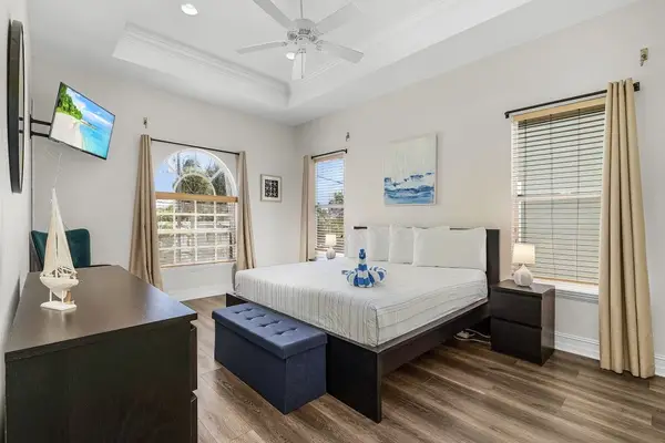 Down the hallway, you'll find two welcoming guest bedrooms. The first features two twin beds and a spacious closet, perfect for kids or friends. The second guest bedroom offers a plush king bed, flat-screen TV with streaming options, and another ample closet. Between the two is a newly renovated bathroom with a shower/tub combo, ideal for guests of all ages.